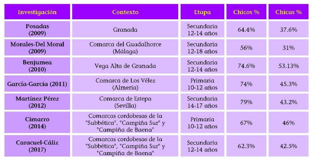 En referencia al ámbito de participación de niños, niñas y jóvenes en actividades deportivas extraescolares, comprobamos como dentro de nuestra Comunidad, hay una gran diversidad, en función del contexto de muestra donde se han realizado las investigaciones.