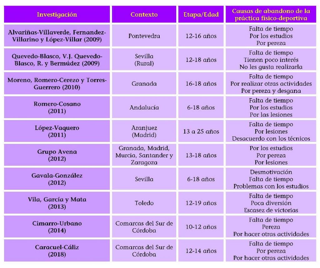 Del análisis de las causas expuestas por los investigadores, nos llevan a concluir que las principales para no realizar actividad físico-deportiva o el abandono de esta práctica es fundamentalmente “por falta de tiempo”, “por pereza”, “por los estudios”, “por realizar otras actividades de ocio”, y en menor medida por “falta de motivación”, “por lesiones” o por “desacuerdo con los técnicos”.