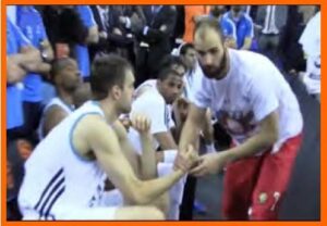 El jugador griego del Olympiakos justo después de ganar la final de la Euroliga de Baloncesto y antes de recoger el trofeo en el podio, se da cuenta de que los jugadores del Real Madrid están hundidos en la otra esquina, en su banquillo. Se baja y saluda, uno por uno, a los componentes del cuerpo técnico del Real Madrid y a todos los jugadores. Es entonces cuando se vuelve a seguir celebrando con su hinchada.
