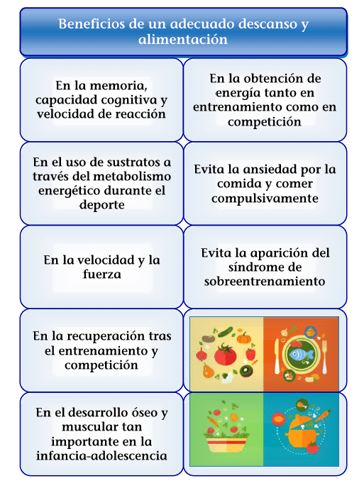No obstante, en el ámbito deportivo, cuando las exigencias físicas se hacen notables y, en edad escolar, cuando se precisa exigencia mental (debido a las tareas académicas), podemos encontrar deportistas que, aun estando sanos, se encuentran cansados y disminuyen su rendimiento tanto académico como deportivo. Aquí hay que tener en cuenta dos aspectos fundamentales: el descanso y la alimentación.