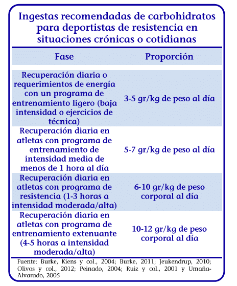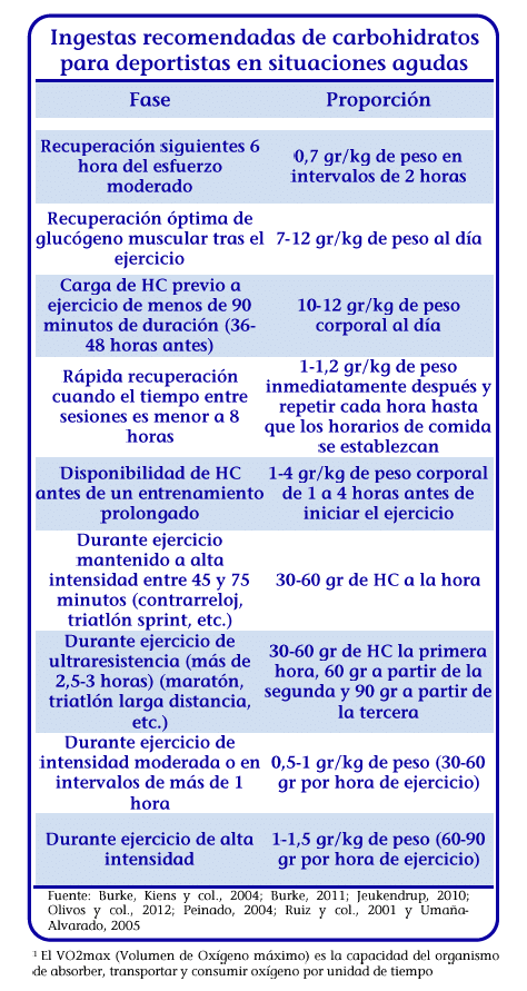 Según todo lo descrito, podemos deducir la importancia de adecuar el aporte de HC a los objetivos del deportista y del entrenamiento. Actualmente se aboga por regular el aporte de carbohidratos en función del peso del individuo y del tipo de entrenamiento realizado cada día.